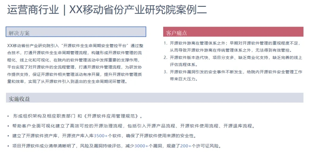 创新和敏捷性:满足市面上大部分客户安全审核要求,为软件做“全身无死角体检”,能够满足企业不断变化开源软件治理的需求。可以帮助客户更快地响应市场变化,推出创新产品和服务,提高企业的竞争力和市场敏捷性。